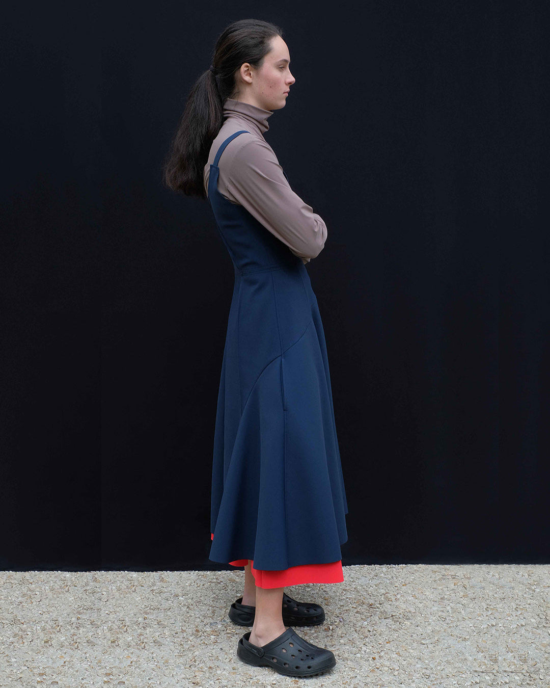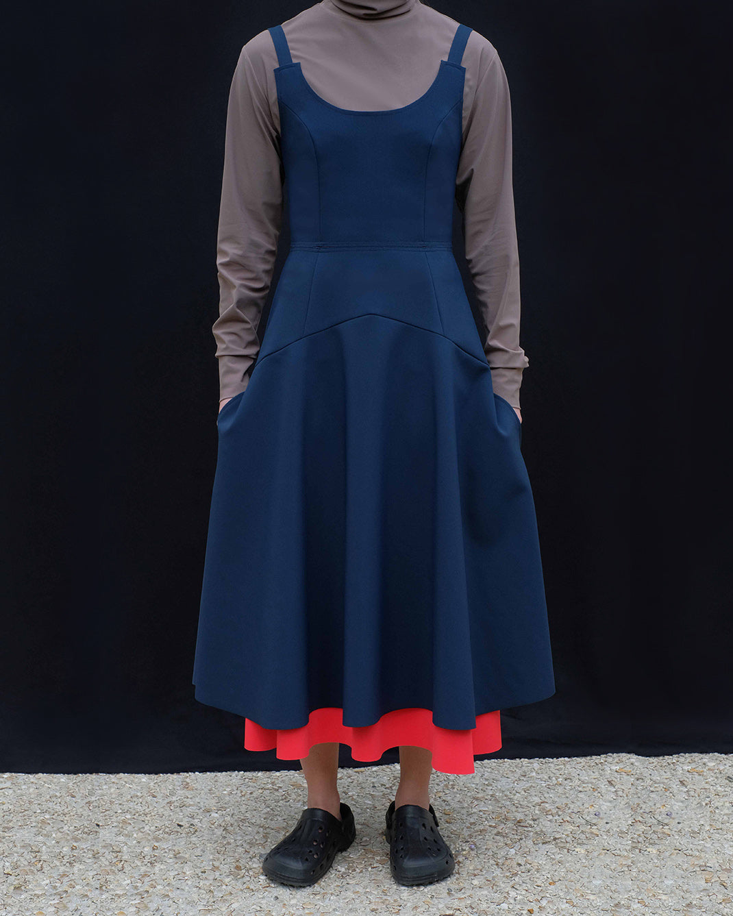 Strap dress, deep round neck (swimsuit inspired), below-the-knee length, flare skirt. With a basque hugging the hips, exposed darts and topstitch details. Has pockets in the side seam and invisible Natulon (recycled plastic) zip in the back