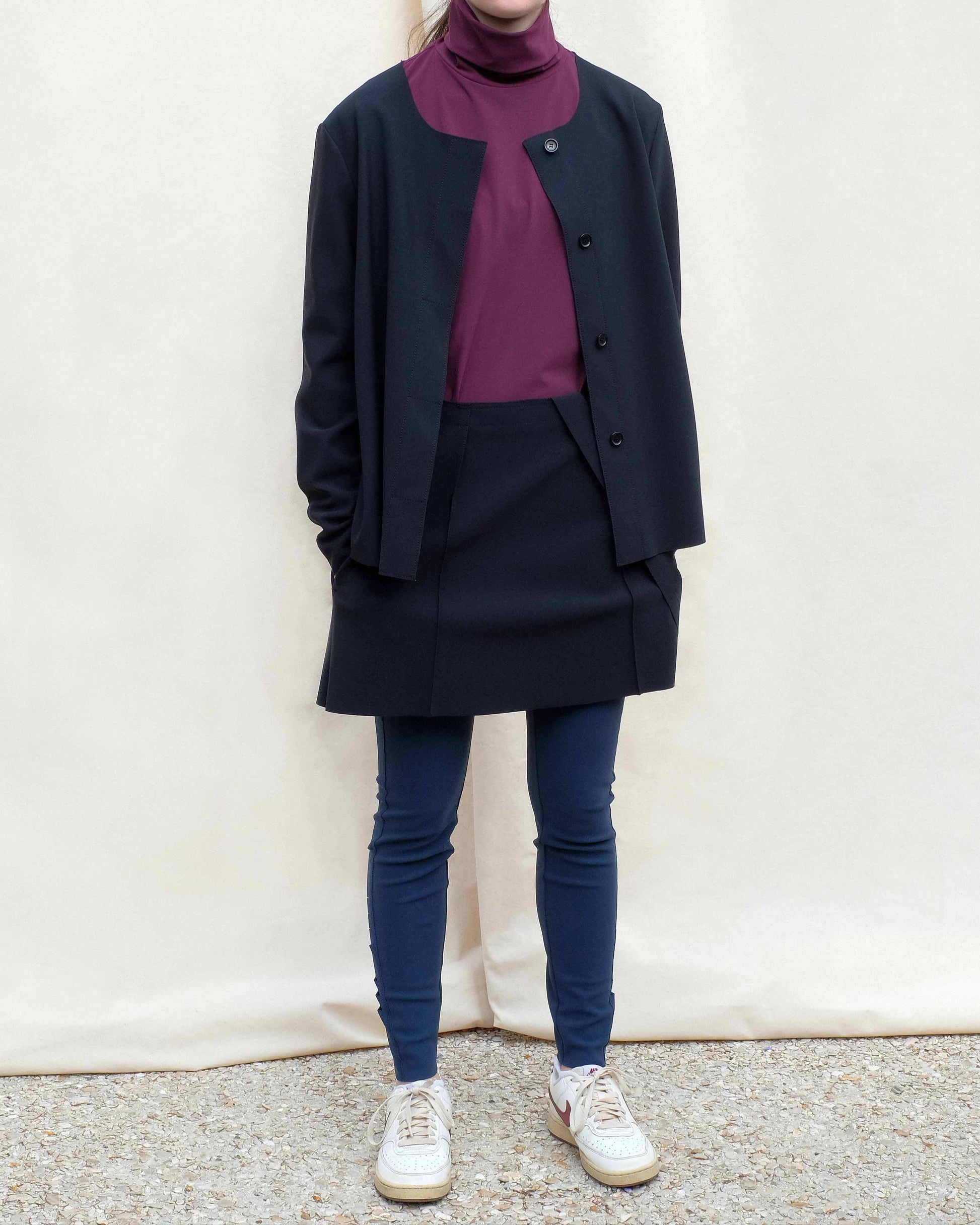 Looks great worn with a wide shirt, a turtleneck, with a boxy mens blazer JKT 4 or a cardigan coat CT 1. We like it under a pair of shorts.